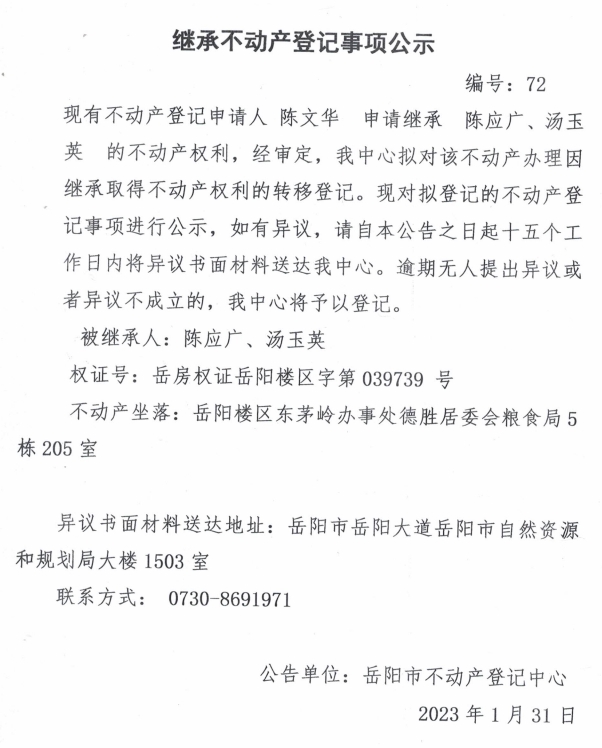 继承不动产登记公示 编号:陈文华(72)