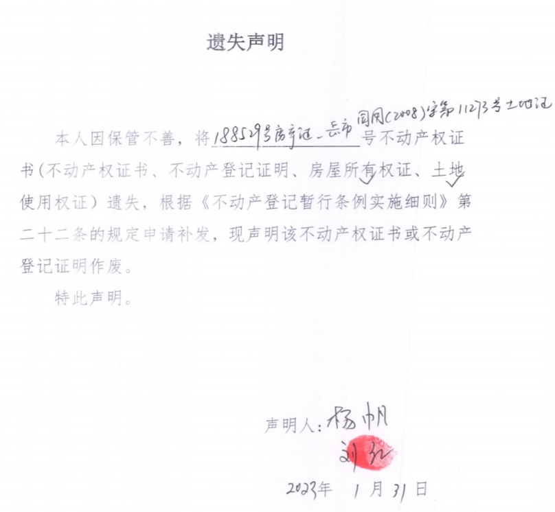 遗失声明(杨帆、刘红)