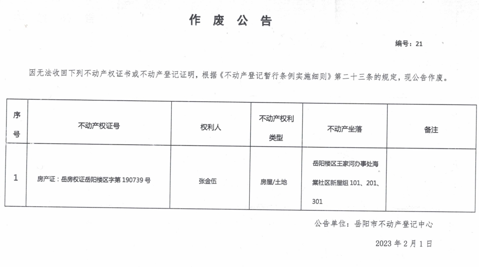 作废公告 编号:21(张金伍)