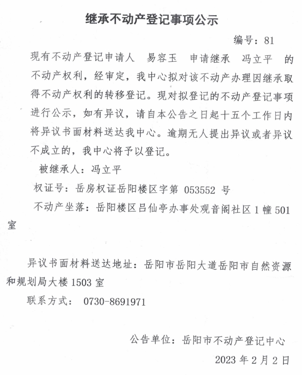 继承不动产登记公示 编号:易容玉(81)