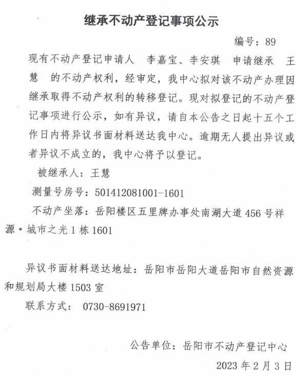 继承不动产登记公示 编号:李嘉宝、李安琪(89)