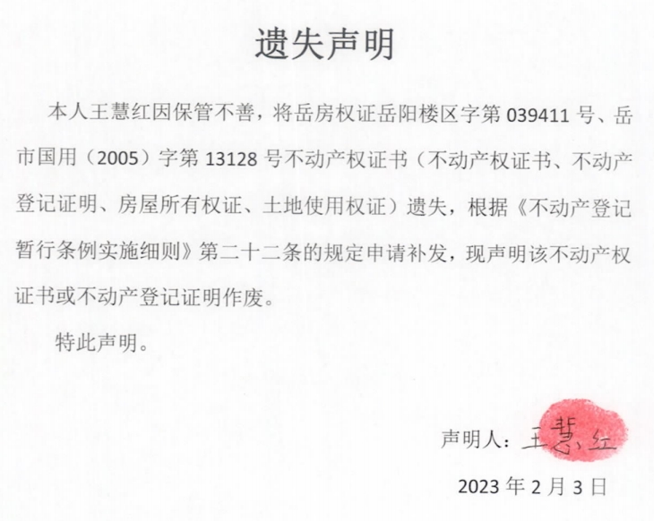 遗失声明(王慧红)