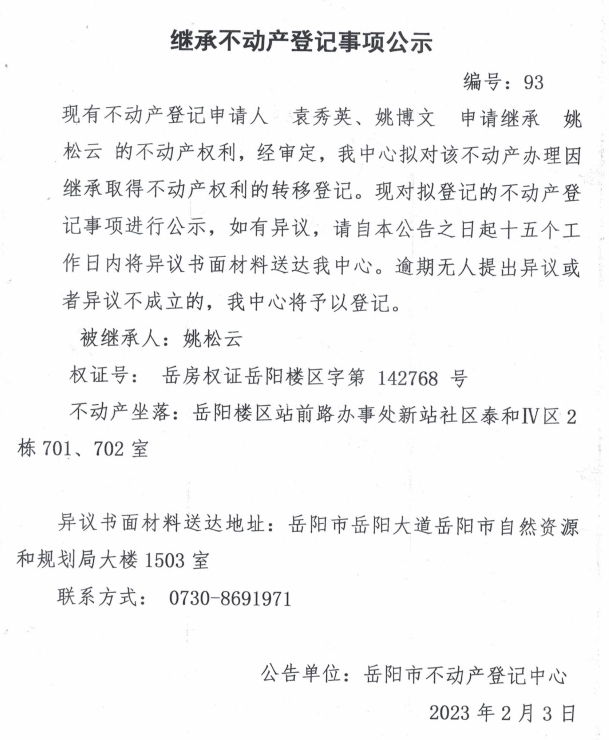 继承不动产登记公示 编号:袁秀英、姚博文(93)