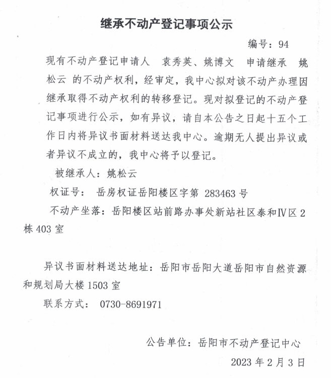 继承不动产登记公示 编号:袁秀英、姚博文(94)