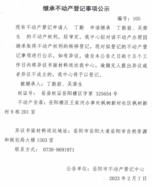 继承不动产登记公示 编号:丁勤(105)