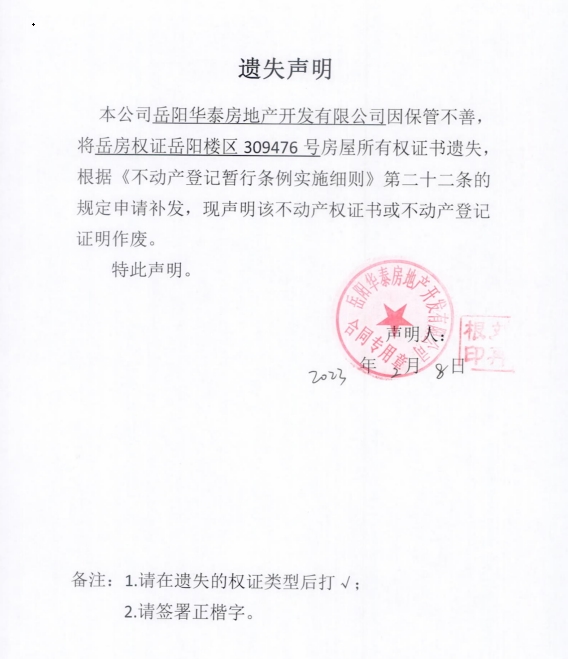 遗失声明(岳阳华泰房地产开发有限公司)1