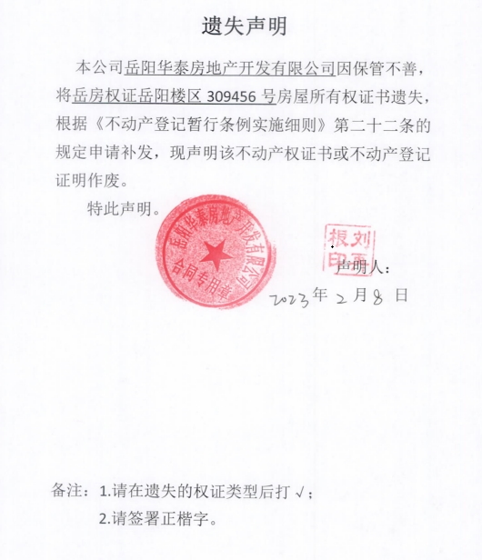 遗失声明(岳阳华泰房地产开发有限公司)2