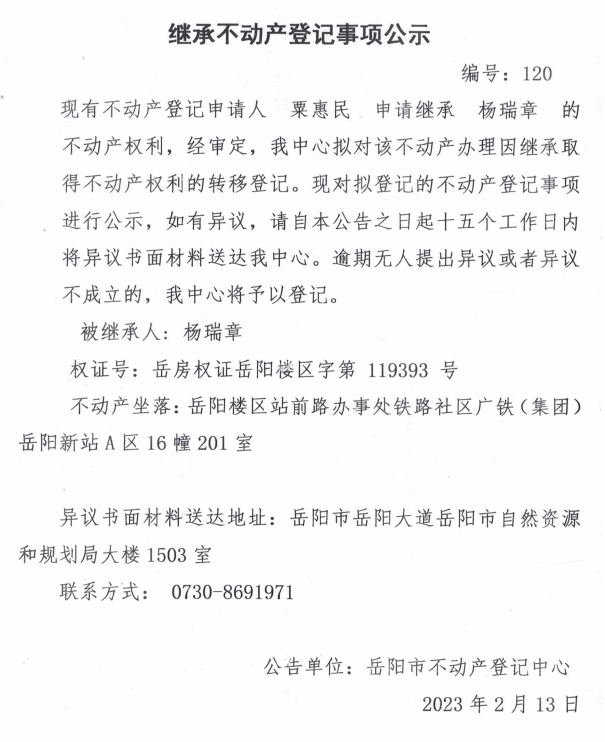 继承不动产登记公示 编号:栗惠民(120)