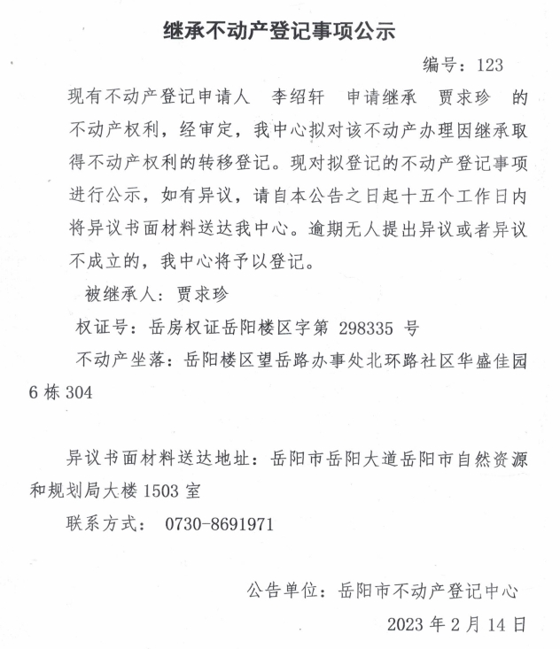 继承不动产登记公示 编号:李绍轩(123)