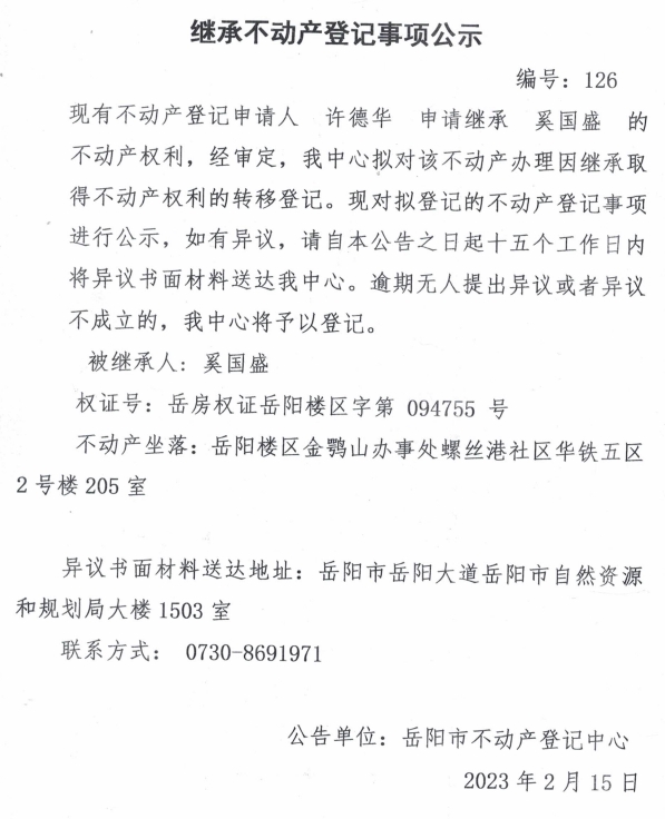 继承不动产登记公示 编号:许德华(126)