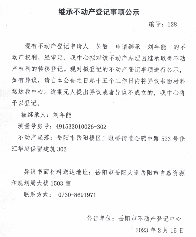 继承不动产登记公示 编号:吴敏(128)