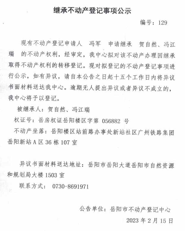 继承不动产登记公示 编号:冯军(129)