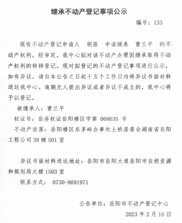 继承不动产登记公示 编号:胡蓓(133)