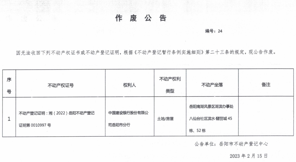 作废公告 编号:24(中国建设银行股份有限公司岳阳市分行)