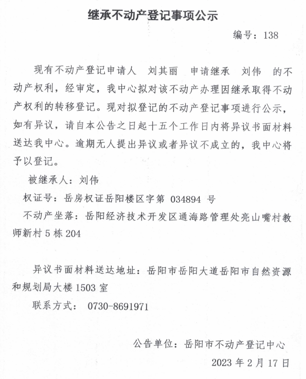 继承不动产登记公示 编号:刘其丽(138)