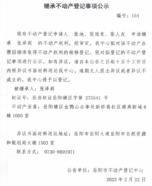 继承不动产登记公示 编号:张池、张珑竞、张人友(154)