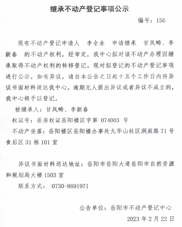 继承不动产登记公示 编号:李全永(156)