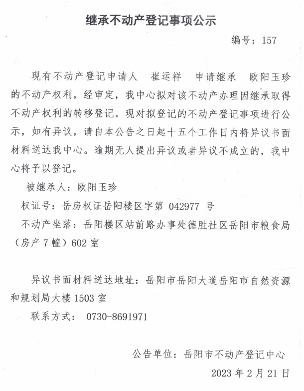 继承不动产登记公示 编号:崔运祥(157)