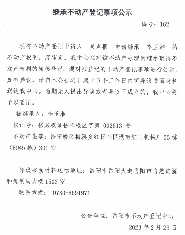 继承不动产登记公示 编号:吴声根(162)