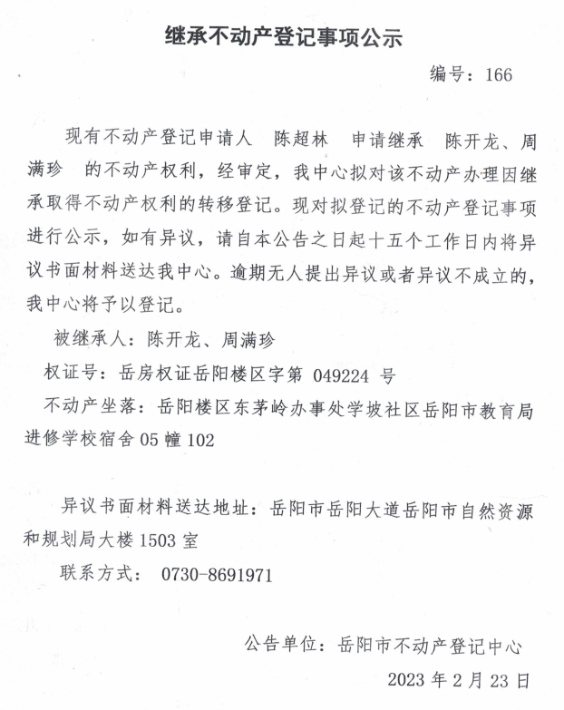 继承不动产登记公示 编号:陈超林(166)