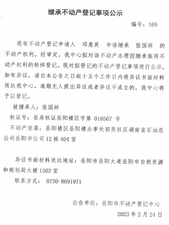 继承不动产登记公示 编号:邓惠英(169)