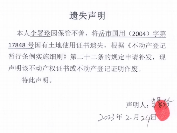 遗失声明(李署珍)