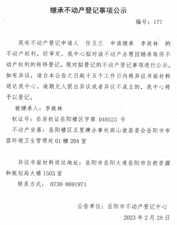 继承不动产登记公示 编号:任玉兰(177)