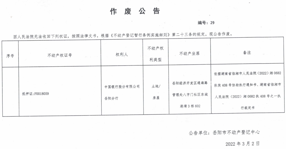 作废公告 编号:29(中国银行股份有限公司岳阳分行)