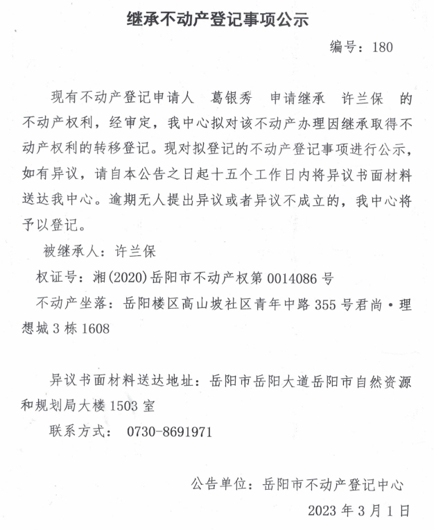 继承不动产登记公示 编号:葛银秀(180)