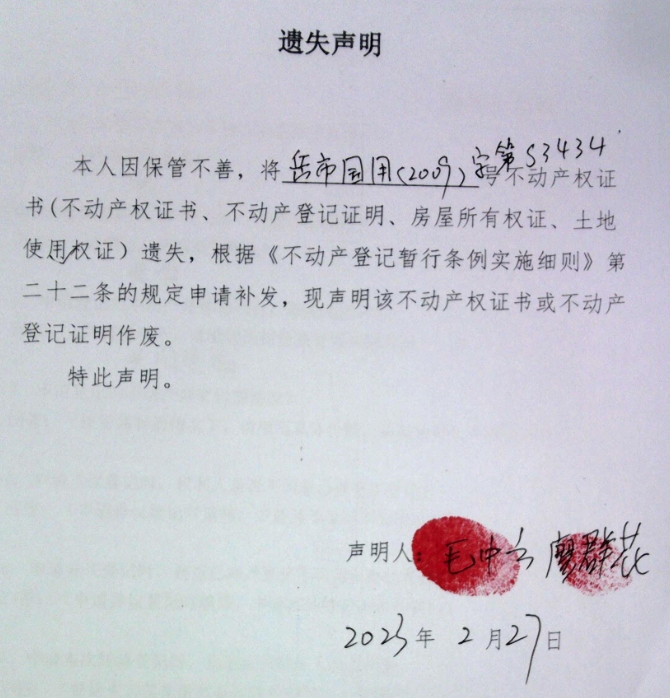遗失声明(毛中云、廖群花)