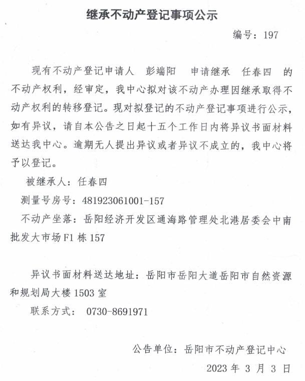 继承不动产登记公示 编号:彭端阳(197)