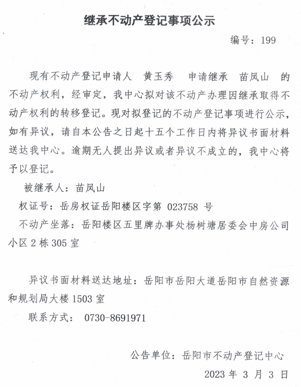 继承不动产登记公示 编号:黄玉秀(199)