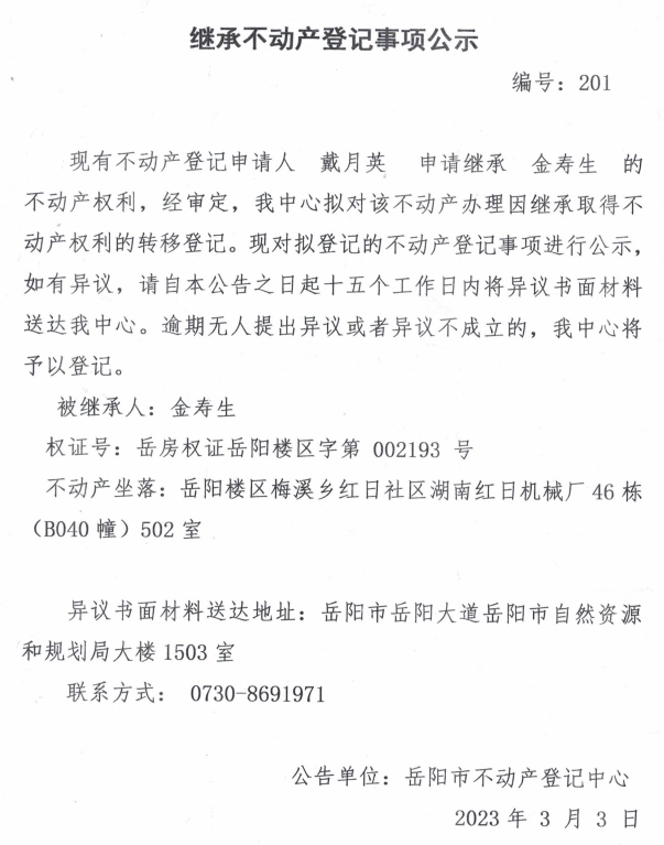 继承不动产登记公示 编号:戴月英(201)