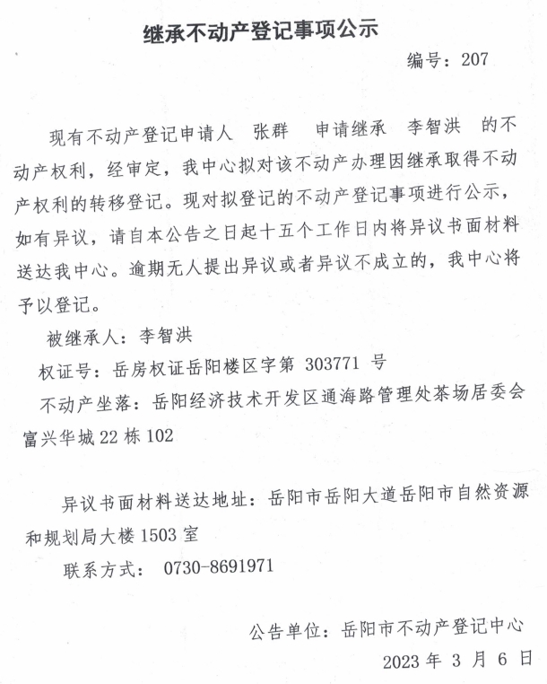 继承不动产登记公示 编号:张群(207)