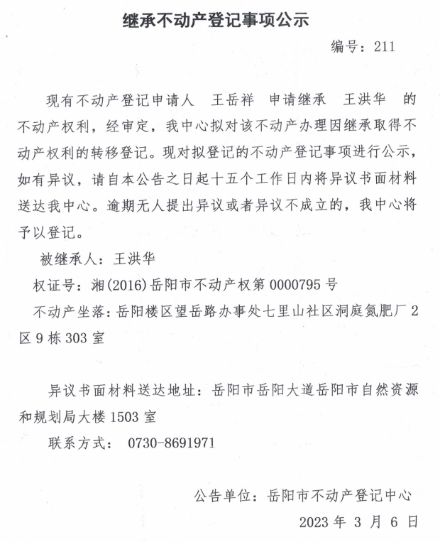 继承不动产登记公示 编号:王岳祥(211)