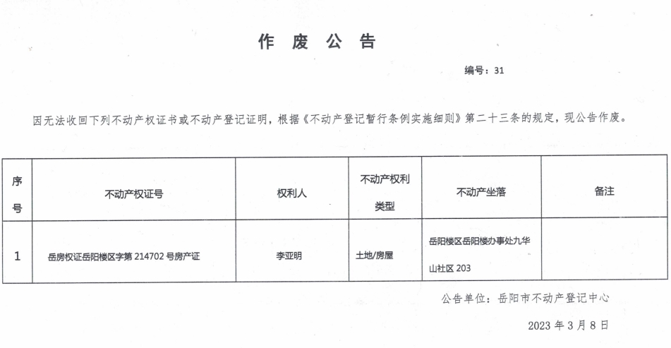 作废公告 编号:31(李亚明)