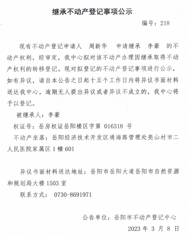 继承不动产登记公示 编号:周新华(218)
