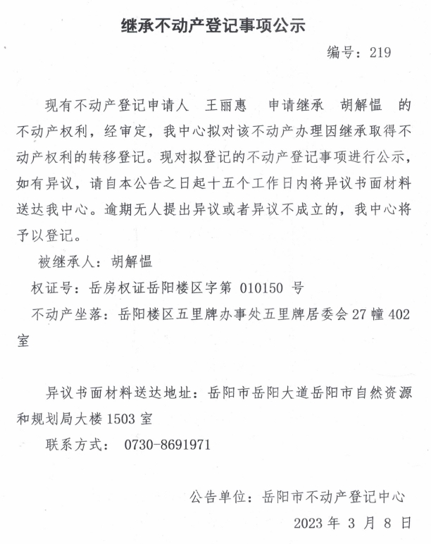 继承不动产登记公示 编号:王丽惠(219)