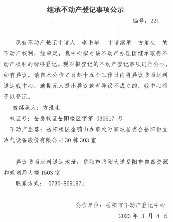 继承不动产登记公示 编号:李毛华(221)