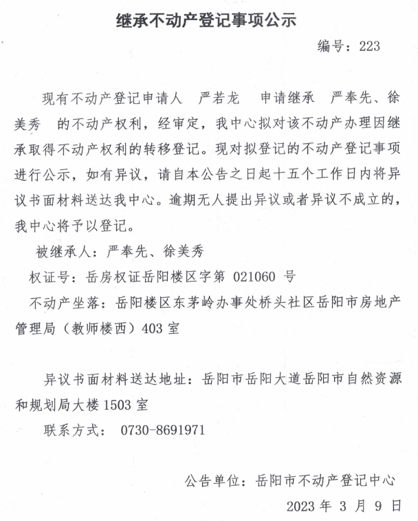 继承不动产登记公示 编号:严若龙(223)