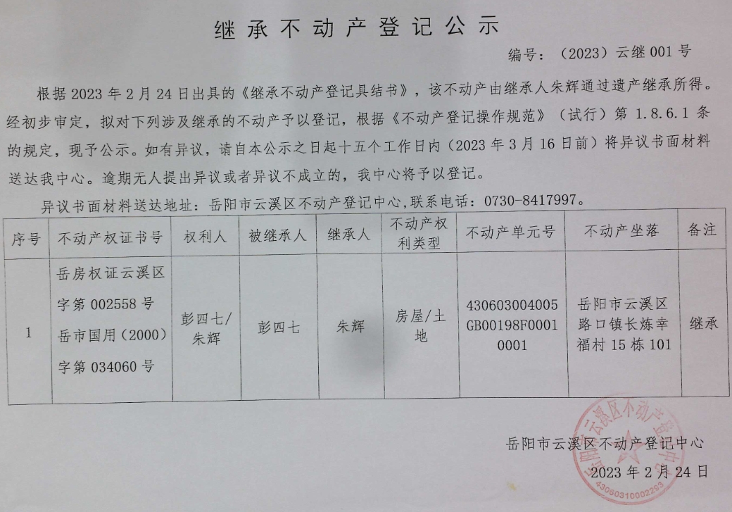 不动产继承公示 编号:(2023)云继001号
