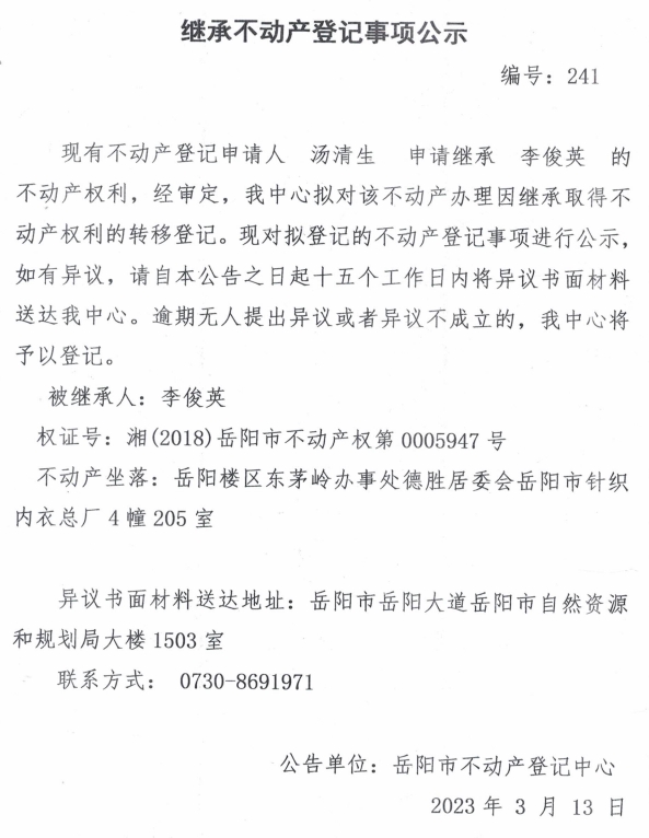 继承不动产登记公示 编号:汤清生(241)