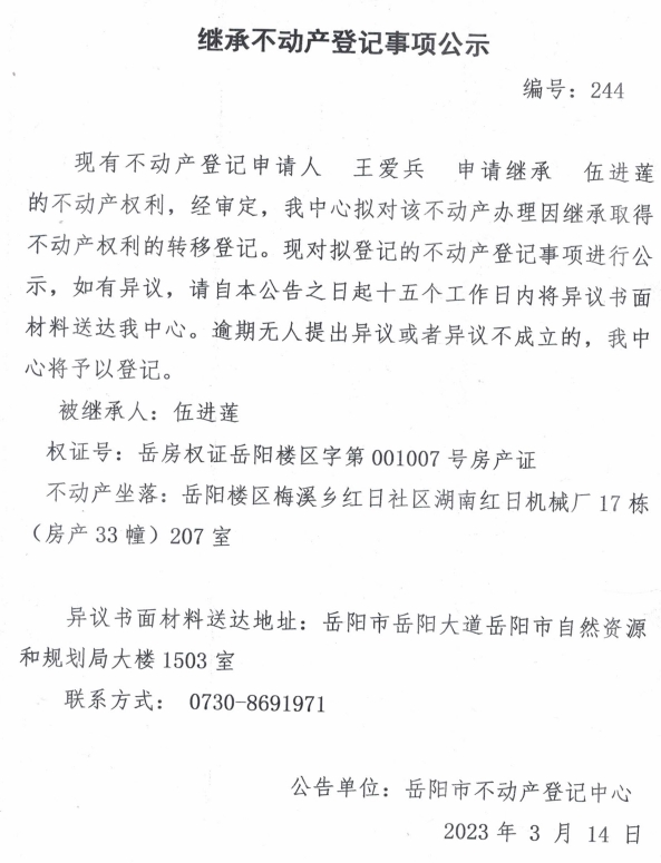 继承不动产登记公示 编号:王爱兵(244)