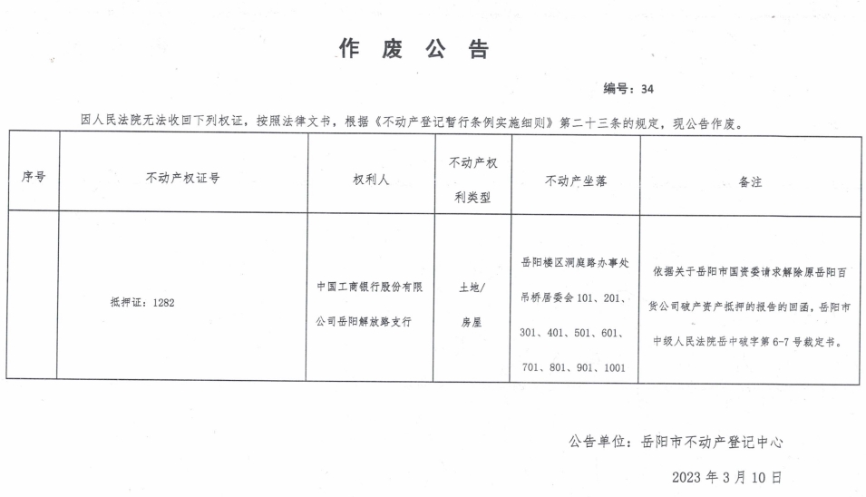 作废公告 编号:34(中国工商银行股份有限公司岳阳解放路支行)