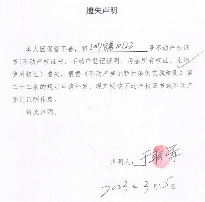 遗失声明(于联军)