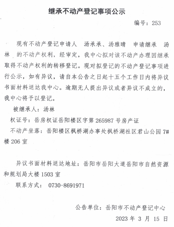 继承不动产登记公示 编号:汤承承、汤雅晴(253)