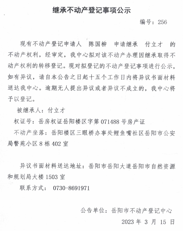 继承不动产登记公示 编号:陈国柳(256)
