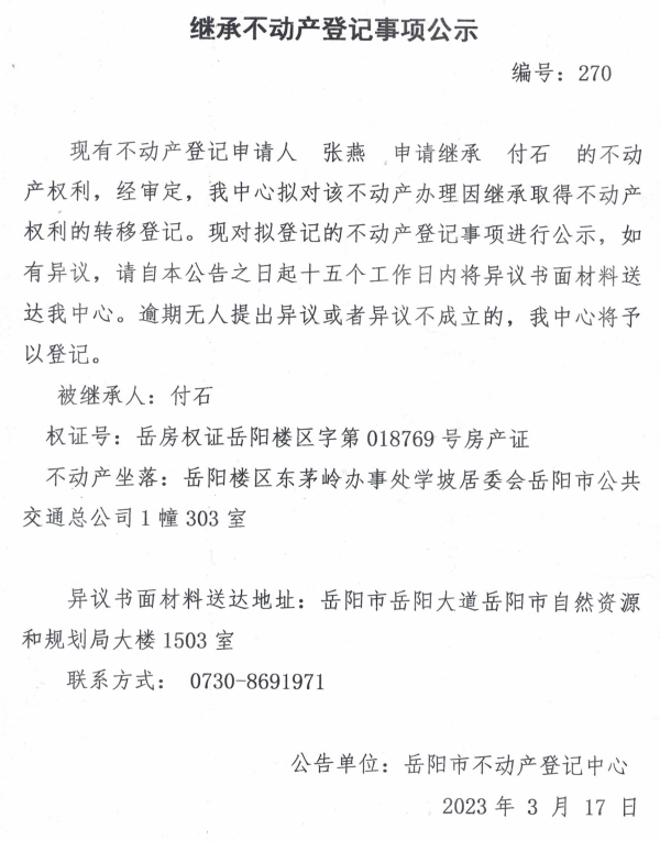 继承不动产登记公示 编号:张燕(270)