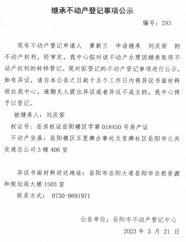 继承不动产登记公示 编号:黄新兰(293)