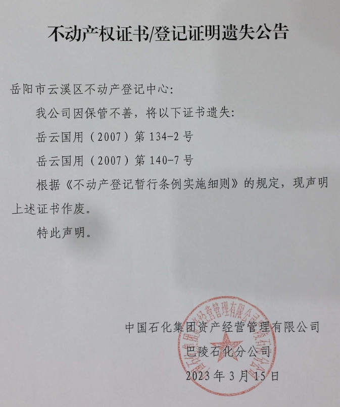 不动产遗失公示(云溪区)